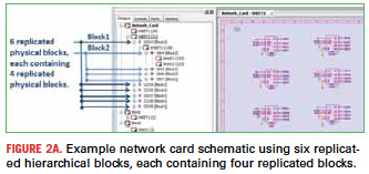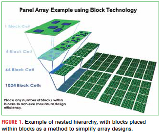 Once traditional hierarchy is in place, more advanced options become available. Many CAE software applications contain the ability to tie a block design directly to a layout block, opening possibilities for organizing both schematic and layout in a more orderly and easy-to-track fashion. This is often referred to as physical hierarchy, and it can be especially useful with design reuse circuits and array types of designs. With array designs, blocks can be organized inside other blocks (Figure 1) in nested hierarchy, making it possible to boil down a very large design into just a few physical blocks to add and maintain.