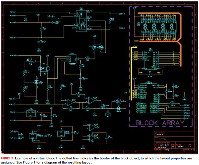 Last, there is a lesser-known hierarchical capability in some schematic software applications that could be useful. This is the concept of a frame, or a virtual block. This is a block that has no block symbol. It is designated by a border drawn around the circuitry meant to be a block, which is most often tied to a physical block in the layout. This kind of hierarchy is especially useful for smaller schematics; if there is only one page of circuitry representing a board design, it can be broken down into any number of blocks without requiring that the circuits be broken up into separate sheets with one top level design to contain the block symbols. Essentially, the one page of circuitry remains one page instead of three or more. Imagine, for example, a block array design. If there is only one small page of simple circuitry (Figure 1), a virtual block could be drawn around it, and then the block can be assigned a number of placed blocks in the layout, a starting placement value, and an X and Y offset per block for automatic placement of the entire array in the layout. So 1024 block cells would be represented by a one-page schematic.